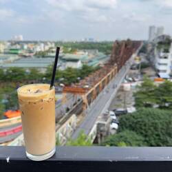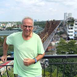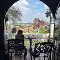 Heute treffen wir unseren Minh im Roof Top Café Serein, eine fantastische Dachterrasse hoch über der rostigen Long Bien Brücke.