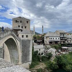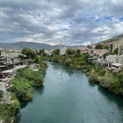 Nach drei Stunden Fahrt von Dubrovnik über die Berge war ich in Mostar angekommen. Von der ersten Auto-Brücke konnte man schon die berühmte Steinbrücke „Stari Most“ sehen.
