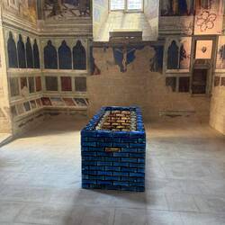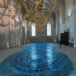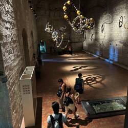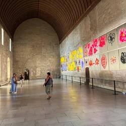 Der Palais des Papes ist riesig. Man kann kaum glauben, dass das alles im 14. Jahrhundert entstanden ist – über 15.000 m², monumentale Säle, dicke Festungsmauern, Türme, Wehrgänge, und ein Innenhof, in dem heute eine moderne Skulptur steht. Die Mischung aus Geschichte und aktueller Kunst war richtig spannend: Spiegel, Glasobjekte, schwebende Perlenringe und geometrische Installationen, die sich perfekt in die Architektur einfügen. Besonders eindrucksvoll: ein riesiger goldener Kugelring über einer blau schimmernden Wasserinstallation mitten in einer ehemaligen Kapelle – surreal schön.