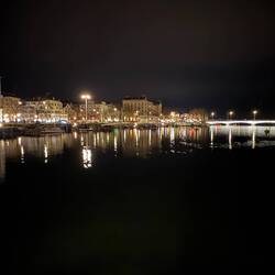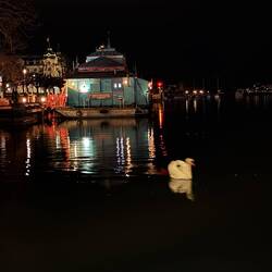 Am Bürkliplatz beginnt der Zürichsee. Tagsüber starten hier die Kursschiffe der Zürichsee-Schifffahrtsgesellschaft, abends liegen die Boote ruhig vertäut. Die Lichter der Stadt spiegeln sich im Wasser, im Hintergrund die dunklen Silhouetten der Hügel.