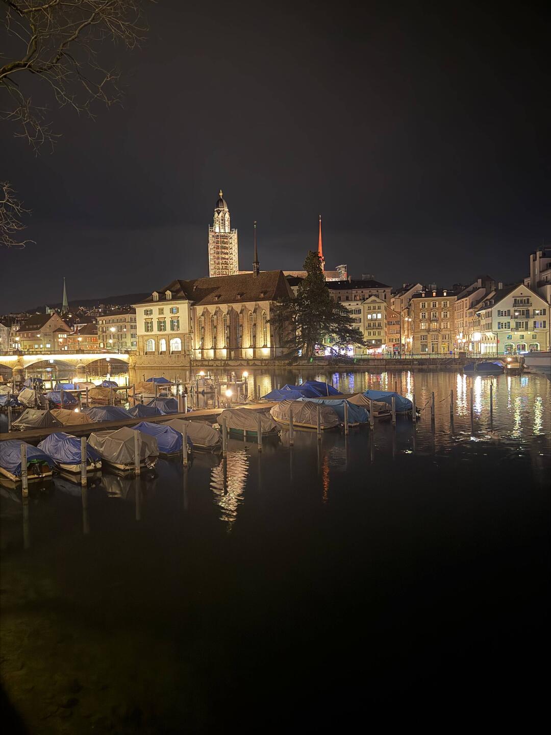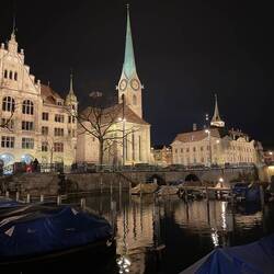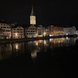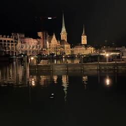 Von dort sind wir Richtung Limmat gelaufen. Die Fotos zeigen vor allem das Gebiet rund um den Bürkliplatz, die Quaibrücke und die Altstadt entlang der Limmat. Die beiden markanten Türme gehören zum Grossmünster, dem Wahrzeichen Zürichs, dessen Ursprünge bis ins 12. Jahrhundert zurückreichen. Direkt gegenüber steht das Fraumünster mit seinem schlanken, grün schimmernden Turm – besonders schön angestrahlt bei Nacht. Berühmt ist es unter anderem für die Chagall-Fenster im Inneren.