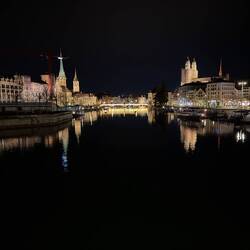 Die Limmat fließt hier aus dem Zürichsee Richtung Norden und teilt die Altstadt in zwei Seiten: links der Lindenhof mit römischer Geschichte, rechts das Niederdorf mit Bars und kleinen Gassen. Nachts wirkt alles fast schon filmreif. Die Spiegelungen der Kirchen, der historischen Zunfthäuser und der Brücken im ruhigen Wasser – dazu vereinzelte Schwäne, die lautlos ihre Kreise ziehen.