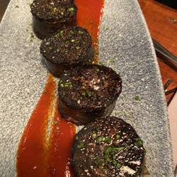 Spanisches Frühstück mit gebratener Blutwurst und Wachteleiern. Wie vermissen wir Barcelona und das tolle Essen.