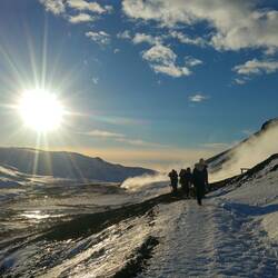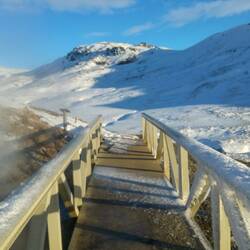 Small hike through a geothermal area to reach the hot river. Upstream the water is even warmer. Amazing spot to enjoy the morning sun!