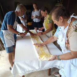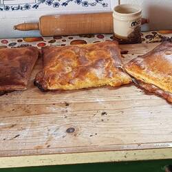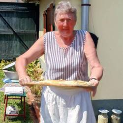 Heute war Backtag mit dem Holzbackofen angesagt. Es würde die erfahrene Luise gebeten, dazu zu kommen. Ab 9:00 wurde Teig geknetet, ausgerollt und geformt. Erst kamen drei große Brote in denBaca lagi