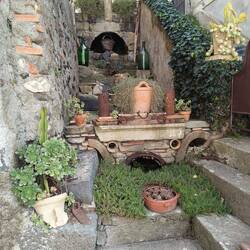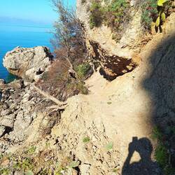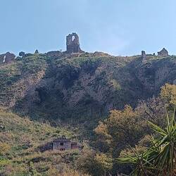Eine Burgruine lacht uns an und hält uns auf. Ein freundlicher Anwohner zeigt uns unaufgefordert den Weg, der nah an den noch bewohnten Häusern vorbeiführt und dann steil und unbefestigt nach oben.Leggi altro