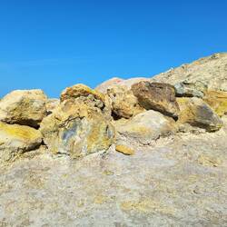 Mit der Fähre fahren wir eine Stunde nach Vulcano, der nahe gelegensten der sieben Schwestern. Dort wollen wir den Krater besteigen (800 m hoch, 8 km), aber ach, die Ampel zeigt rot. Wir überlegenLeggi altro