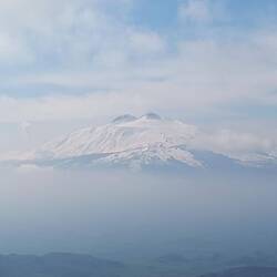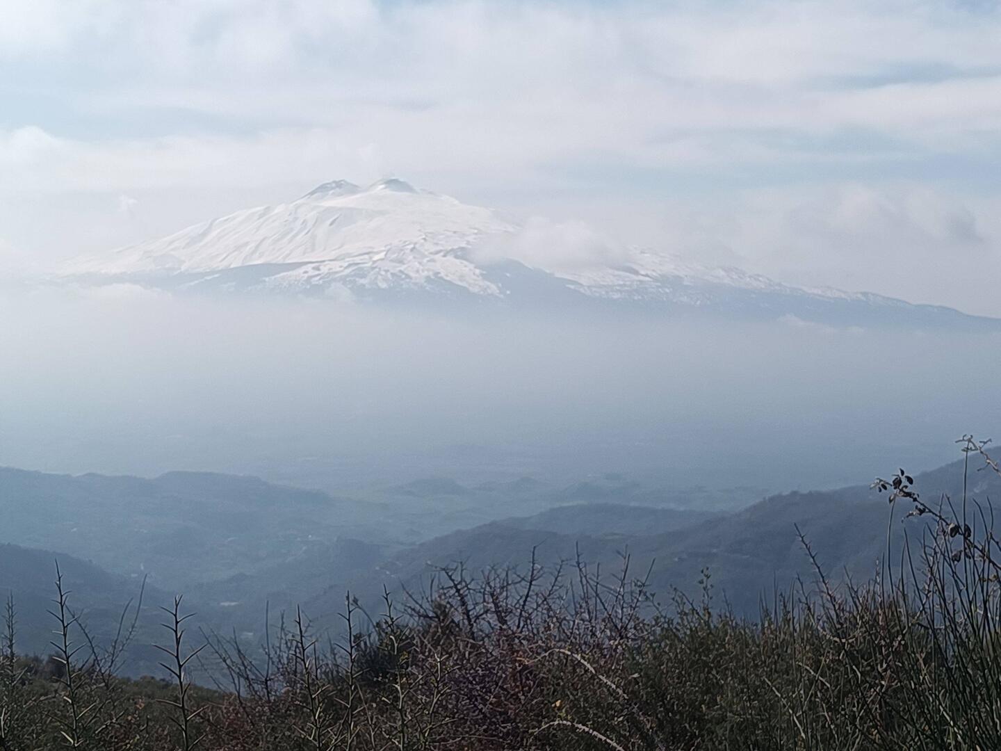 Plötzlich, hinter einer Kurve taucht der Ätna auf, majestätisch, beeindruckend, oberhalb einer Wolkendecke, leicht rauchend, schneebedeckt.