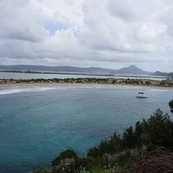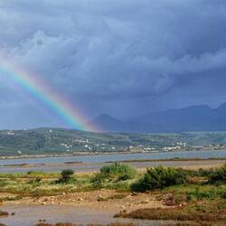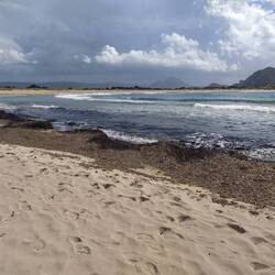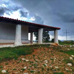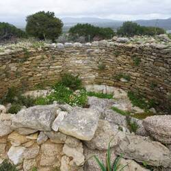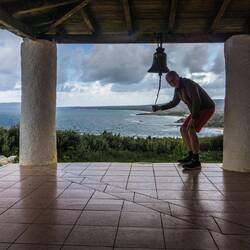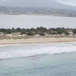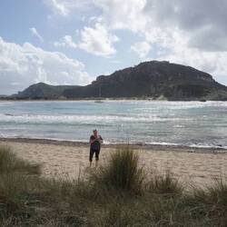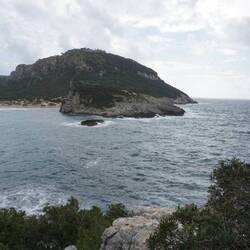 Es geht weiter über eine gut ausgebaute Nebenstraße Richtung Küste. Wir kreuzen die E09 und es geht über eine schmale Straße von Norden an die Ochsenbauchbucht. Der Vidocoilia Strand wird auf Grund seiner Form im griechischen auch als Omega bezeichnet und ist vor allem als Ochsenbauchbucht bekannt. Die kleine Bucht mit feinem Sand zählt zu den schönsten der Peloponnes. Viel haben wir heute nicht vom Strand, es ist immer noch sehr stürmisch. Während Kerstin Siesta macht, begebe ich mich auf den Weg zu einem Cache an der Profitis Ilias Kapelle hin, auf einem Hügel nördlich der Bucht. Ich nehme den Aufgang an der Bucht und komme erst am Gewölbten Grab von Voidokilia vorbei. Es handelt sich um das Grab von Nestors Sohn Thrasymedes aus der mykenischen Zeit (1680–1060 v. Chr.). Von hier hat man auch noch Mal einen schönen Blick in die Ochsenbauchbucht. Den weitern Weg zur Kapelle muss ich dann ganz schön suchen. Anhand der Strichellinie auf meiner Karte bahne ich mir den Weg durchs Gestrüpp. An der Kapelle hat man einen wunderschönen Ausblick die Küste entlang nach Norden. Der hier liegende Cache wurde gefunden. Die Kapelle kann nicht besichtigt werden. Unter dem Vordach der Kapelle schütze ich mich vor dem einsetzenden Regen. Als es etwas nachgelassen hat, gehe ich die Straße zurück zum Wohnmobil.