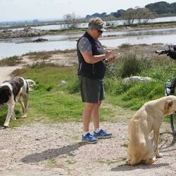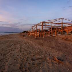 Wir wollten heute mit dem Rad bis an die Prokopos-Lagune. Laut Streckenplan sollte die kürzeste Strecke zwischen dem Wald von Strofylia und dem Lamia-Sumpf bis zur Lagune verlaufen. Eine gute Straße führt erst bis ans Meer. Dort biegen wir rechts auf eine feste Sandstraße in den Strofyliawald ab. Die ersten Wasserlachen über die Straße machen noch Spaß und waren auch überschaubar. Nach einigen 100 Metern ist der Weg so weit wir sehen können überflutet. Ein Ende ist nicht erkennbar und die Tiefe können wir nicht einschätzen. Wir drehen um, dass macht einen Umweg von 10 km aus. Erst über Sandwege, dann weiter über kleine Straßen, immer zwischen riesigen Flächen mit Gewächshäusern hindurch, geht es im Bogen um das Stumpf Gebiet. Hier werden im großen Stil Erdbeeren angebaut und vermutlich durch billig Arbeitskräfte gepflückt. Ab und zu sehen wir in den Gewächshäusern und an Hütten nahe der Felder viele dunkelhäutige Arbeiter.