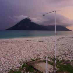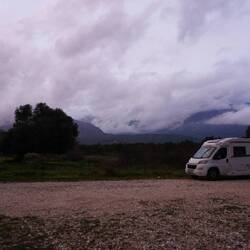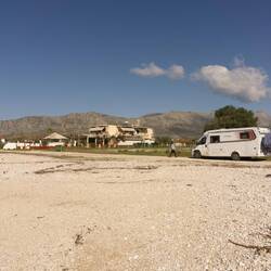 Wir besuchen die Lagune von Messolonghi. Die Zufahrt an die Spitze wird gerade ausgebaut, ist aber befahrbar. Vorn angekommen schüttet es wie aus Kannen. Wir entscheiden uns für die Weiterfahrt. Ein Stück weiter, sehen wir uns noch die kleine Insel Phoenicia am Rande der Salzwiesen zwischen Messolonghi und Etoliko an. Auf der Insel gibt es eine kleine Kirche aus dem 18. Jahrhundert, die der Jungfrau Maria gewidmet ist. Auch die Lagunenstadt Etoliko (griechisch auch Aitoliko) besichtigen wir noch, geführt werden wir dabei durch einen LAB Cache. Wir folgen der Küste Richtung Norden. Die Fahrt ist landschaftlich sehr schön mit dem Blick aufs Meer und die vorgelagerten Inseln, aber die anvisierten Stellplätze nichts für uns. Zu steile Anfahrten, zu schlammig oder zu schmutzig.