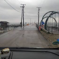 Auf dem Weg nach Mesolongi ist nach Hinweisen eine Brücke gesperrt. Eine Über das ca. 300 m breite Flußbett des Evinos wird die Brücke erneuert. Es gibt aber eine gewaltige Behelfsüberfahrt, die nur für Fahrzeuge über 10 m gesperrt ist. Theoretisch, uns kommen auch große Busse entgegen 😂.