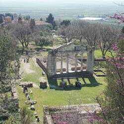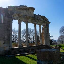 Mittagspause machen wir in Apollonia. Apollonia ist die größte archäologische Stätte Albaniens. Diese antike, berühmte Stadt wurde um 600 v. Chr. gegründet und war die erste, die den Namen des Gottes Apollon trug. In der Römerzeit wurde sie zu einem großen Kulturzentrum, das für seine Philosophieschule sehr bekannt war. Als Anerkennung für ihre Unterstützung während des Krieges gegen Pompeji erhielt sie von Caesar den Status einer „freien Stadt“. Er schickte seinen Neffen Octave, den späteren Kaiser Augustus, dorthin, um seine Ausbildung zu vervollkommnen. Es gibt beeindruckende Überreste dieses klassischen Kunstreichtums zu entdecken: Außenmauern (5. und 6. Jahrhundert n. Chr.), Säulenhallen, Tempel, Odeon, Bibliothek, Triumphbogen, Bouleuterion oder Denkmal des Agonothètes, Gymnasium, Häuser, Gasthaus, Brunnen, Theater …