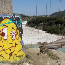 Wir wählen für die Weiterfahrt den Weg durch das Tal der Shushica. Einerseits ist die Strecke kürzer als die Küstenstraße und andererseits gibt es auf dieser Route zweier Brückencaches, die mich interessieren. Hinter Qeparo verlässt man die SH8 in Richtung Berge. Die gut ausgebaute Straße führt durch ein landschaftlich schönes Tal bis auf eine Höhe von 614 m bevor es dann wieder etwas bergab geht und man ins Shushica Tal kommt. Die Shushica entspringt im Hinterland der Albanischen Riviera und fließt 81,6 Kilometer nordwärts parallel zur Küste des Ionischen Meers und der Adria durch den Qark Vlora. Der Fluss hat ein breites Tal geformt und man kommt immer wieder durch kleine Orte. Wir machen eine Kaffeepause, die Dame im Kaffee versteht uns nicht und so muß einer der jungen Gäste uns bedienen. Immer wieder sind Reste der alten Straße und Hängebrücken die den Fluss überspannen zu sehen. An zwei dieser Brücken liegt ein Cache. Beim Ersten (Golden Goat Bridge - GCAE73J) muß man die Brücke überqueren. Ich darf erst rüber gehen, nachdem Kerstin gesehen hat, wie der Schäfer mir seiner Schafherde das Bauwerk benutzte.