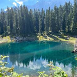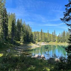 Der Karersee befindet sich unterhalb des Karerpass am Fuße des Latemar-Massivs in Südtirol und ist ein Naturdenkmal.