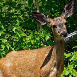 Nach einem gemütlichen Frühstück mit Besuch von zwei Weißwedelhirschen geht es wieder Richtung Logan Pass, diesmal von Westen. Auf halber Höhe halten wir wieder und laufen diesmal zum Granit PeakLæs mere