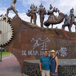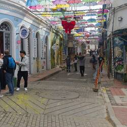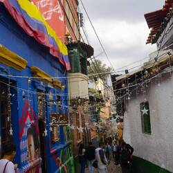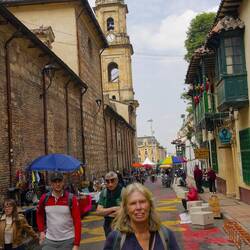 Wir haben erstaunlich ruhig auf dem Parkplatz geschlafen. Nach etwa 30 minütiger Suche haben wir auch einen Uber, welcher uns in die Innenstadt von Bogota fährt. Auf der Rückseite der Hauptkathedrale lassen wir uns absetzen und gehen erst mal in die „Puerta Falsa“, ein Restaurant in dem es die berühmte Schokolade mit Käse gibt. Es ist proppenvoll. Wir bekommen einen Platz und bestellen eine Portion. Mir ist Schokolade mit Käse nicht geheuer. Thomas ist da sehr viel experimentierfreudiger. Ich trinke etwas von der Schokolade ab und dann ist sie nicht mehr heiß genug um den Käse zu schmelzen. Schade, aber Thomas schmeckt es. Dann besichtigen wir die Kathedrale, den Plaza Bolivar, gehen die alte Straße steil den Berg rauf, vorbei am Theater und alten Kolonialbauten. Die Stadt ist nicht wirklich hübsch. Dann schauen wir uns das Parlament von außen an und den Präsidentenpalast. Wir schlendern die Fußgängerzone zur ältesten Kirche Francisco. Da wir Durst haben gehen wir in einen winzigen Supermarkt und kaufen zwei Flaschen Wasser und eine Cola. Und da ist es passiert. Mir wird unbemerkt im Gedränge des Geschäfts mein Handy aus der kleinen Umhängetasche entwendet. Es ist zwar nur mein altes Handy, aber trotzdem bin ich überrumpelt und geschockt. Das alte Handy habe ich in großen Städten immer in der Tasche um nach Googe Maps zu schauen und zu fotografieren. Das eigentliche Handy steckt in einem Bauchgurt und gibt einen Hotspot an das alte Handy. Das ist meine Versicherung, dass mir nie mein aktuelles Handy gestohlen wir. Hier hat genau diese Versicherung zugeschlagen. Dennoch sehr ärgerlich! Trotzdem es geht weiter. Wir haben eine Free Walking Tour durch die Altstadt Candelaria gebucht, aber die gibt's im nächsten Footprint...Read more