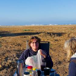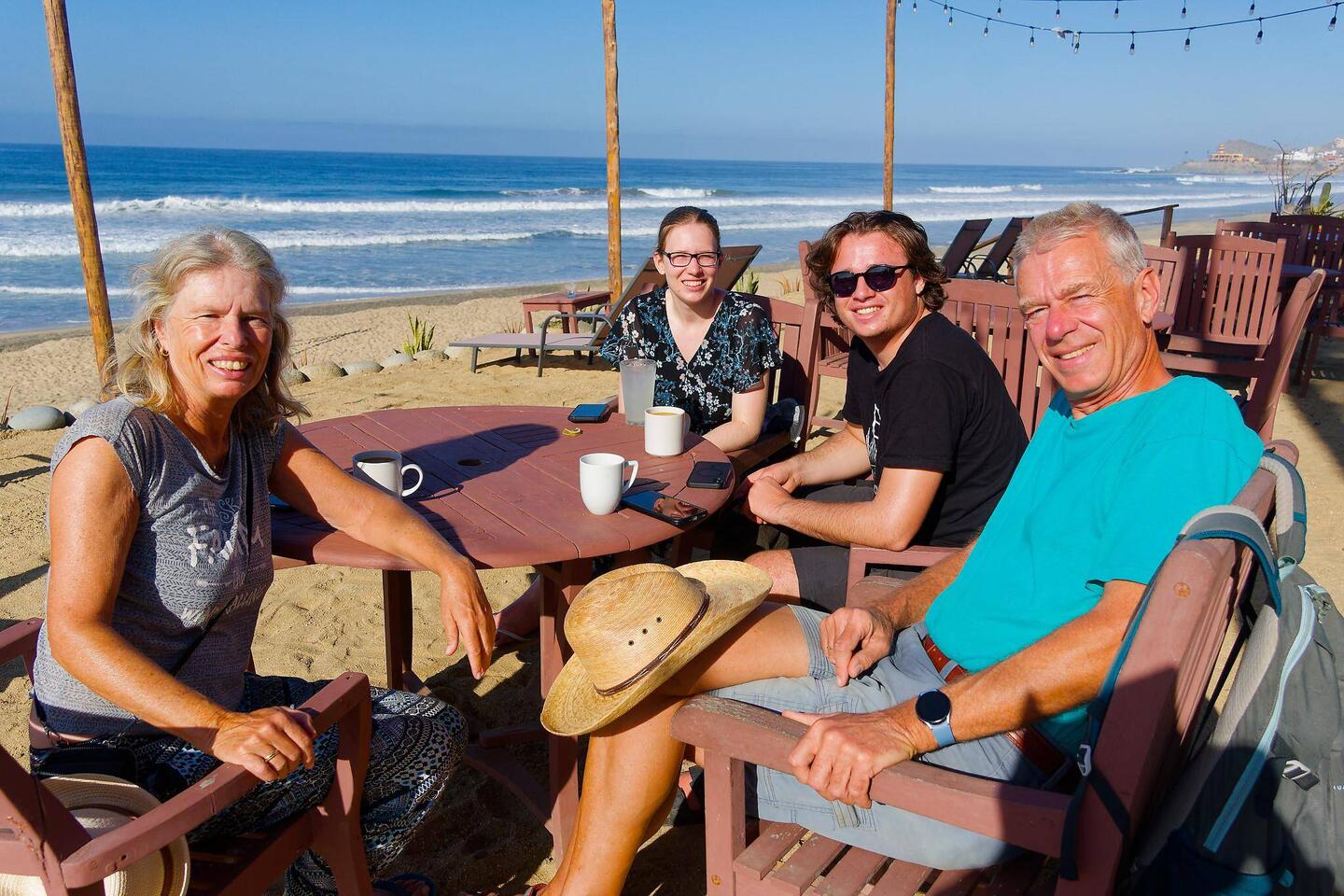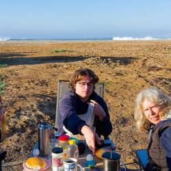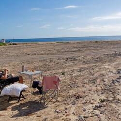 Nach einer ruhigen Nacht haben wir unseren Frühstückstisch direkt an den Strand neben den Schweizer gestellt. Dieser kommt irgendwann raus und ist überaus freundlich. Wir dachten schon er würdeLeggi altro