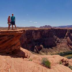 Nach dieser netten Begegnung geht es am nächsten Tag weiter im Valley of the Gods die zweite Hälfte und wir sind sehr froh uns auch dafür den ganzen Tag Zeit gelassen zu haben. Zurück in Mexican Hut tanken wir und fahren weiter an Monument Valley vorbei und halten natürlich am Forest Gump Point um die unendliche Straße zu fotografieren, welche im Monument Valley endet. Jetzt haben wir zwei Versionen Fotos. Vor zwei Tagen im Regen und diesmal strahlend blau. Auf den Weg nach Kayenta fliegt uns ein Stein in die Windschutzscheibe und verursacht ein Loch mit einem kleinen Riß. Wir halten also in Kayenta in einer Autowerkstatt an, welche sich auf Glasreperaturen spezialisiert hat. Doch leider ist es Freitag und es müssen noch zwei Autoscheiben repariert werden. Da schaffen sie unsere nicht mehr. Mist, wir fahren weiter und halten in einem Geschäft in dem es Autoteile gibt. Dort können wir für ein paar Dollar ein Repair-Kit erwerben. Ist kinderleicht selber zu machen versichert der Verkäufer, aber auch da gibt es keinen der es machen könnte. Also liest Thomas sich die Gebrauchsanleitung durch. Zunächst einmal muss die Scheibe kühler als 25 Grad sein. Nicht so einfach bei dem Sonnenschein und den mangelnden Schatten. Wir fahren ’rum und suchen ein schattiges Plätzchen. Eine Schnellimbisskette mit Drive-In und schattigen Unterständen um sein Fast Food zu essen ist am geeignetsten. Wir stellen uns in den Schatten und ich besorge erst mal für mich French Toast und für Thomas einen Frühstücks-Burrito mit Speck. Jetzt hat Thomas die Anleitung genau studiert und lässt sich erst mal seinen Burrito schmecken. Dann ist die Scheibe kühl genug und los geht es mit der Einspritzung des Glasklebers in den Riß. Das ganze funktioniert erstaunlich gut und benötigt nur etwas Zeit. Nach jedem einzelnen Arbeitsschritt müssen entsprechende Wartezeiten eingehalten werden. Erst den Kleber mit Druck rein, dann Unterdruck erzeugen und danach alles glatt abschaben. Und schon ist Thomas ein Glasreparatur-Experte. Kann glatt bei Carglass anfangen. Und weiter geht es bei uns zum Navajo Monument. Das liegt auf dem Weg nach Page. Zunächst stellen wir das Buschen auf den angrenzenden Campingplatz und gehen dann los. Wir gehen entlang eines tiefen Canyons, welcher am Grund erstaunlich grün ist. In einer Höhle am Grund des Canyons haben sich Pueblo Indianer vor mehr als 500 Jahren eine kleine Stadt gebaut. Wir wollen dahin, müssen aber feststellen, dass man dorthin nicht ohne Rangerführung kommt und diese wegen der Vorsaison noch nicht stattfindet. Also bewundern wir vom Rand des Canyons das Bauwerk. Die Pueblo Indianer haben schon ganz ordentlich mehrgeschossig gebaut. Nach diesen Abendspaziergang gibt es noch einen schönen Sonnenuntergang am Sunset Campground, der seinen Namen alle Ehre macht. Wir unterhalten uns dabei mit unserem Campingnachbarn, einem Ehepaar aus Minnessota, welche nun alles verkauft haben und mit dem Wohnwagen durch Amerika ziehen, bis sie einen schönen Platz zum bleiben gefunden haben. Sie waren schon mehrfach in Europa und waren besonders begeistert von ihrer letzten Japanreise.Leggi altro