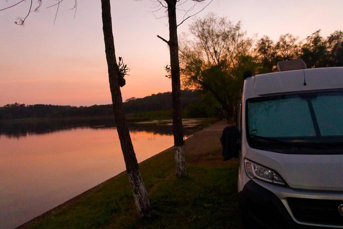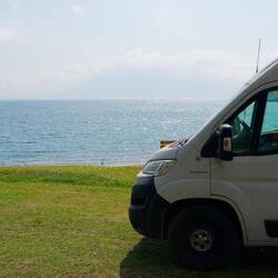 Am nächsten Morgen erwachen wir vom quietschen der Motorbremsen der runterfahrenden Laster und Busse. Der Weg zum See ist schon steil und wir liegen im direkten Schallkegel. Dafür entschädigt unsLæs mere