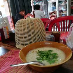Auf der belebten Hauptstraße entscheide ich mich mutig für ein traditionelles laotisches Frühstück. Suppe. Schüchtern versuchen die Köchin und ich uns an der Zusammenstellung der Zutaten. Sprossen, frische Kräuter und eine klare Brühe mit Reis. Ich vermute, es war Hühnchen. Sehr lecker und überhaupt nicht scharf gewürzt.