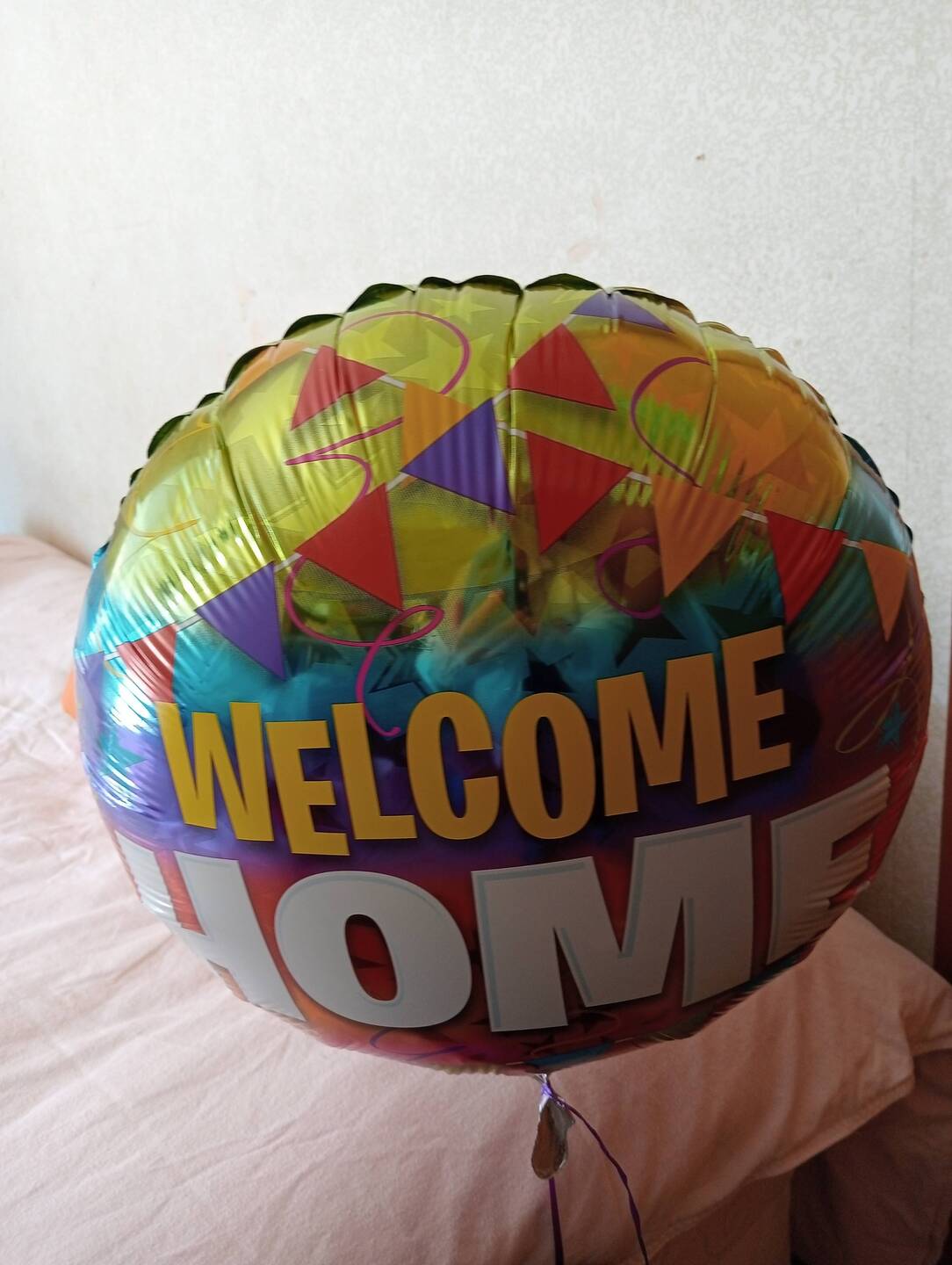 We're now waiting in huge line of people at customs, but I caught the eye of an aid who took me to electronic check out and was through quickly. Mary-Ellen and grandson James were waiting for me with a big bunch of flowers and a welcome home balloon✈️ but biggest gift was themselves hugs galore, tears and laughter 😅😥❤️🩹💙...