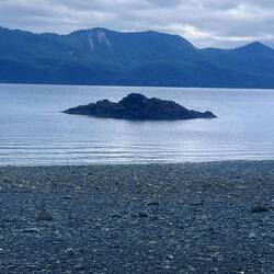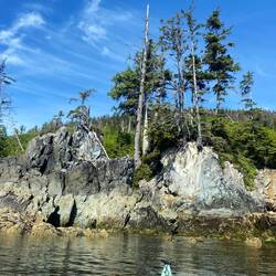 Paddling a fully packed double kayak is a lot more work too. We paddled south along the east side of Lyell Island past some exquisite landscape. We spied sea caves and surprising number of gorgeous and inviting beaches. We saw a rhinoceros auklet, ancient murrelets, marbled murrelets, pigeon guillemots, cormorants, and lots and lots of eagles. A game developed with all rules and points was made up by Jill - she is the tour company’s owners son. She was a hoot. We saw harbour seals and deer.