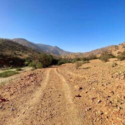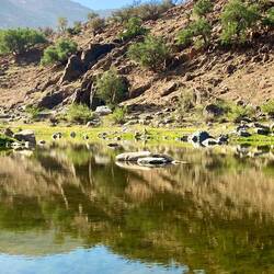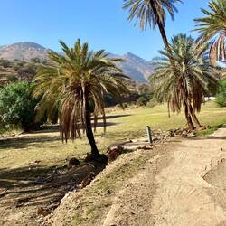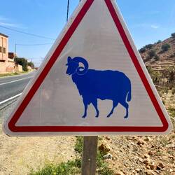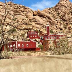 Am nächsten Tag wechseln wir den Stellplatz und fahren ins Tal der Ammeln, nur einige Kilometer hinter Tafraout. Der Nachbar erzählt uns, dass man im Restaurant auf dem Platz sehr gut essen könne. Wir schauen uns die Karte an und sehen schnell, dass es die identische Karte des La Kasbah ist 😀. Als dann der Chef vom Stellplatz am Abend noch vorbeikommt und fragt, ob wir vor unserem Camper gerne einen großen Teppich wollen, ist alles klar. Er ist der kleine Bruder unseres Teppichhändlers und hatte am Tag zuvor im La Kasbah mal geschwind noch fehlende Zutaten für unsere Tajine mit dem Mofa vom Souk geholt, um anschließend eine deutschen Reisegruppe, die neben uns am Tisch saß, ebenfalls in „seinen“ Teppichladen gegenüber einzuladen. Auch der Witz mit „inschallah“ war identisch. Kam bei der Reisegruppe aber irgendwie besser an als bei mir 🤔😅.
