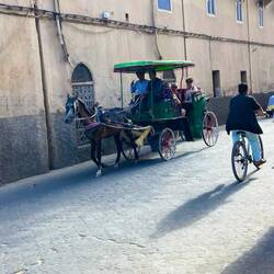 Auf dem Weg zurück wollten wir die Stadt, die sich leider nicht so richtig als Juwel zeigen wollte, dann doch nochmal versöhnlicher kennenlernen und buchten spontan eine Kutschfahrt. Und wer steht plötzlich da und organisiert uns eine Kutsche, übersetzt für uns mit dem Kutscher, wo wir dann aussteigen wollen und verhandelt den Preis - genau, der Berber von 10min vorher und 500m weiter. Irre! „Inschallah“ dachten wir dann und stiegen ein. Und tatsächlich wurden wir eine ganze Stunde durch die Stadt gefahren, einmal Außenrum, zweimal mittendurch und zum Schluß waren wir da, wo wir hinwollten. Greta hatte ihren Spaß von der Kutsche allen (!) Menschen zu winken und freute sich wie ein Schnitzel, wenn jemand (und das waren viele) freundlich zurückwinkte. Von einem jungen Marokkaner gab’s sogar einen Handkuss zugehaucht und da wurde Greta fast ein wenig rot im Gesicht …En savoir plus