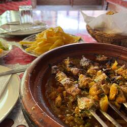 Während Beate genau in diesem Nichts ein längeres berufliches Telefonat führen musste, enterten Greta und ich das einzige Restaurant in Tamtetoucht. Der Wirt kam mir vor, als habe er sich vor 20 Jahren überlegt, ein Gasthaus auf dem Mars auf zu machen, weil ja irgendwann schon mal Astronauten dort hin kommen würden. Und heute kamen wir. Der Wirt spratzelte also sofort hin und her und er war von Beginn an irritiert, dass die Frau im Auto bleiben musste. Er zeigte uns die Karte und ich entschied mich für zwei „Sandwich with Chicken“, einem Minztee und einen Orangensaft für Greta. Er lächelte, freute sich und verschwand. Wenig später wurde dann der Tisch gedeckt - für 3 Personen. Er signalisierte mir wieder, dass meine Frau da draußen doch auch hungrig sein musste. Ich gestikulierte mit den Händen „wichtiges Telefonat“, er lächelte und brachte das Essen. Zwei Salatteller und eine große Tajine mit Hühnerspießen! Es war mehr als üppig und genau - es war egal, was wir bestellten, denn es gab einfach die Spezialität des Marses äh des Hauses. Der Wirt sagte immer nur „Eat, eat!“ und kam ähnlich wie in dem Loriot-Sketch im Minutentakt, um zu fragen, ob es schmeckt. Es schmeckte fantastisch. In einer Tajine gibt es ja immer diesen verkochten Bodensatz aus Soße, Gemüse und was eben noch so auseinanderfällt. Das Beste also! Ich war dankbar, kein wichtiges Telefonat führen zu müssen und hab dann Beate auf der Weiterfahrt zum Ausgleich eine kleine Brotzeit vom Beifahrersitz aus gereicht 😉.