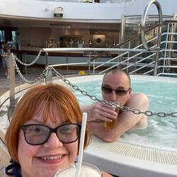 Upon wandering round the ship we noticed there are far more hot tubs than on previous ships, and we are partial to a couple of hours in the tub, so that’s what we did. Sharon attempted to use the app to order a pina colada but unfortunately it’s not letting her in - apparently she hasn’t paid, I didn’t laugh (too much) but I’m sure she wouldn’t have got on the shop if she hadn’t paid. We were out on the open decks for the sail away party and made use of the sun loungers for a couple of hours before returning to our cabin .