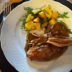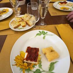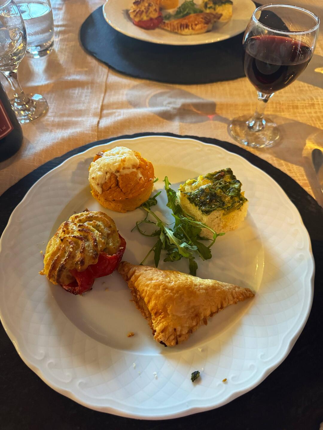 Erste Vorspeise „Antipasti Caldi”, zweite Vorspeise (ohne Bild) Pasti mit Pesto alla Genovese. Der Hauptgang am Karfreitag: „Das Schwein war kein Fisch“