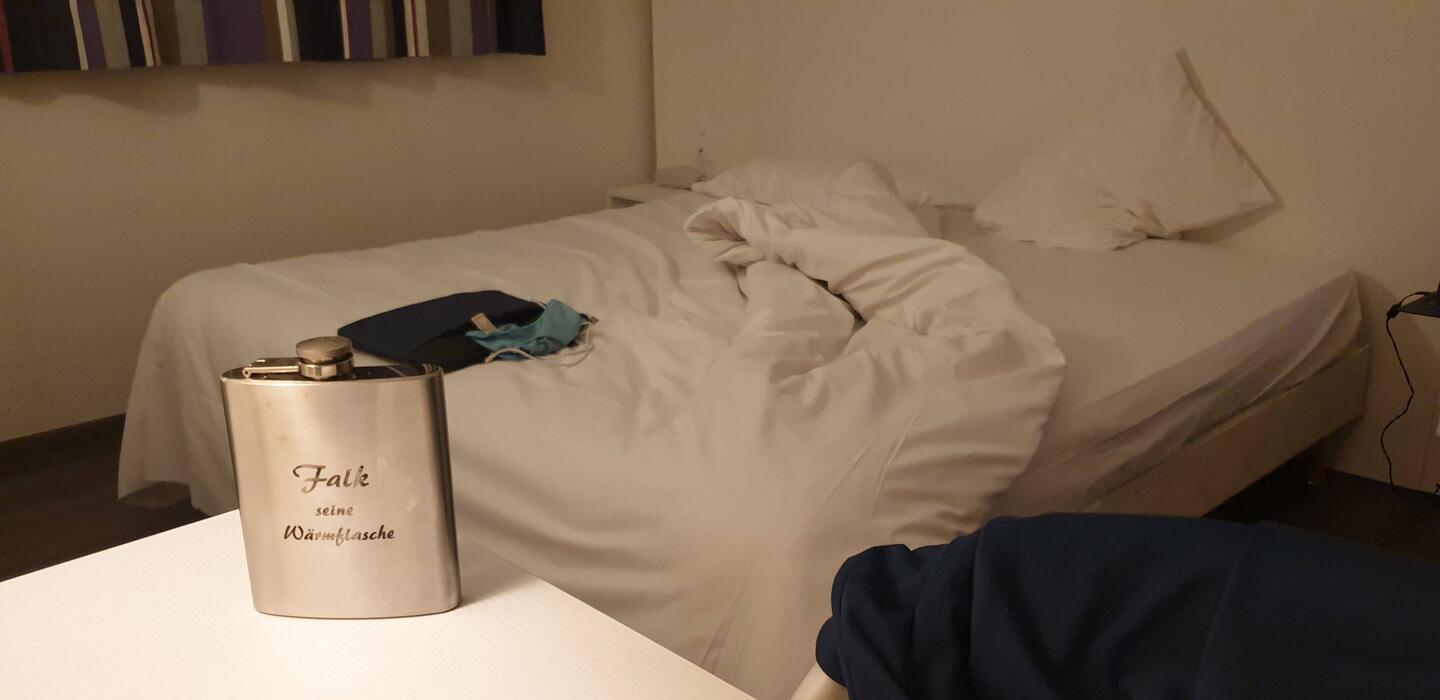 Kurze Pause im Hotel. Mit eigener Wärmflasche. Nach 1400km am Stück kann man mal einen Schluck daraus nehmen.