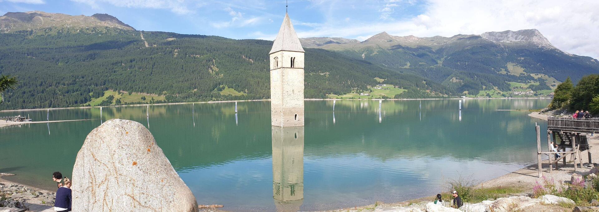 Haltemuss an der Altgrainer Kirche im Reschensee