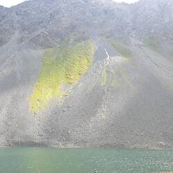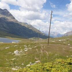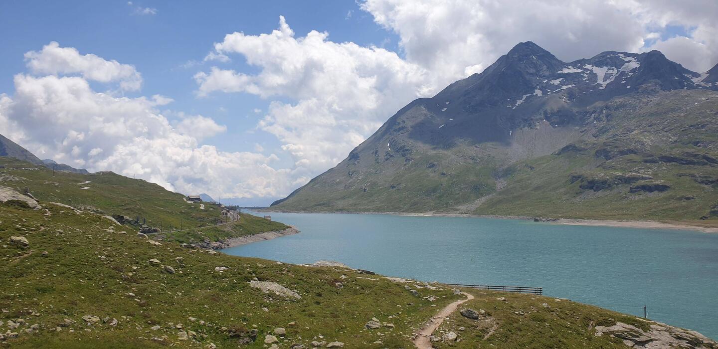 Der Lago Bianco am Berninapass hat zwei Staumauer. Und der Berninaexpress ist auch über den Pass gefahren.