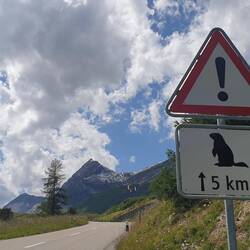 Wir waren gerade am Albulapass und fahren jetzt wieder runter. Mit einem Schild Wildwechsel der besonderen Art