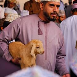 Il est 6H15, on est en route pour le marché au bestiaux. Pour trouver c'est facile, on suit les pick-ups remplis de biques. Sur place, quelle ambiance ! Le parking du souk est blindé. Les animaux sont attachés le temps que commencent le défilé et les enchères. Les propriétaires vantent les mérites de leur animal, les acheteurs tripotent les bêtes pour se décider. 80 rials la chèvre, 30 rials les chevreaux. Un peu plus loin, c'est le marché aux armes. Un papy agite une carabine en faisant l'article. A Nizwa, il y a des affaires à faire...