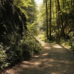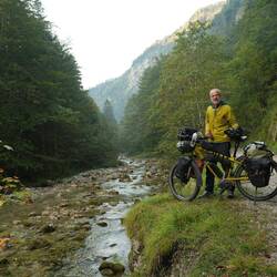 Vor allem zum Nachbarn rüber möchte man ein richtiges Spektakel bieten. Es geht einen Waldweg so 10km in eine Schlucht hinein Richtung Österreich. Dann muss ich das Radl abstellen und eine halbe Stunde hochkraxeln und bin oben an einem alten Schmugglerpfad. Genau an der Grenze gibt es diesen Wasserfall namens Staubfall. Und jetzt pass auf: wenn du über die Grenze willst, musst du unter dem Wasserfall durch. Echte Grenzerfahrung.