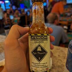 Ich habe also einen Nacho mit Soße beladen und genüsslich verschlungen. Fünf Sekunden später bemerkte ich meinen fatalen Fehler, als ich das Gefühl hatte, dass sich die Höllen aus Mordor in meinem Mund ausbreiten 😂 Ich habe sogar minimal Kreislauf bekommen, das Schwitzen hörte gar nicht mehr auf und ich konnte einfach nichts tun als zu sitzen und es abzuwarten 🌶️ Irgendwann schaffte ich es dann mal einen Blick auf die Flasche zu werfen 😅 Es handelte sich augenscheinlich nur um pürierte Skorpion-chilli mit ein bisschen Salz 🥹