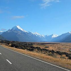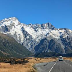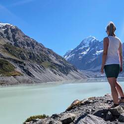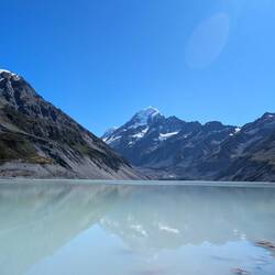 Der Hooker Valley Track führt zwischen den Bergen hindurch, an einem Gletscher vorbei (der hat richtig laut geknarzt!) und ab an den Hooker Lake mit BlickLäs mer
