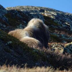 Pascals Schritte wurden plötzlich langsamer und er deutete auf eine Erhöhung. Da, direkt vor unseren Augen, eine Moschusochsen-Familie mit zwei Jungtieren!