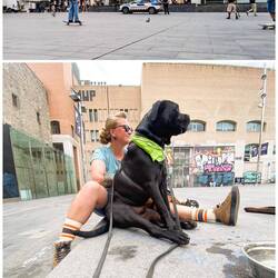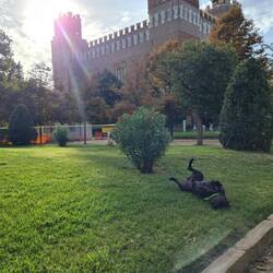 Der Park ist direkt gegenüber und wieder voller Leben. Es gibt spielen verschiedene Musiker, es wird gezeichnet, geslacklined, Jongliert und am schönsten von allem sind die Hunde die durch den ganzen Zirkus hindurch toben weil es sie überhaupt nicht interessiert. Eine blonde große Hündin steht mit einmal bei uns und sagt Hallo. Total lieb und fröhlich, die Jungs sind gleich hin und weg. Sie toben kurz alle 3 und zwischendurch teilen die Jungs das Wasser mir ihr. Dann drehen Spencer und sie nochmal so richtig schön durch und toben, während Baloo sich in Schatten auf den Rasen legt und ein wenig entspannt. Spencers neue Freundin heißt Luna und ist ca. 2 Jahre alt. Ihr Frauchen spricht englisch und auf meine Nachfragen wegen diesen vielen Hunden ohne Leine trotz der ganzen Schilder, erklärt sie mir. Eigentlich ist im Park Leinenpflicht und außerhalb des Parks nicht. Also in der Stadt im Zentrum kannst du machen was du willst aber im Park muss der Hund an die Leine. Aber keiner hält sich im Park dran und wenn die Polizei kommt sieht sie es einfach nicht. Das schöne ist auch, daß hier keiner von den Anderen Im Park meckert. Alle sind entspannt und lachen noch wenn die Hunde voller Freude über die Wieder rennen, nur knapp an ihnen vorbei. Es ist wirklich eine so schöne fröhlich entspannte Atmosphäre. Wir liegen hier noch eine Weile so rum, auf dem neuen Liegetuch was Susi uns organisiert hat. Immer wieder kommen andere Hunde entlang. Es sind ausschließlich positive Kontakte die die Jungs hier haben, einfach fantastisch.