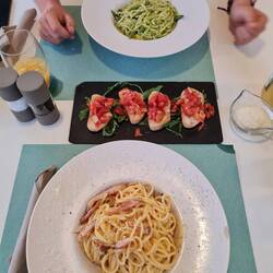 Jetzt haben die Hunde erstmal ihre Zeit verdient. Wir richten noch alles in Liesels Bude ein, damit sie aus ihrem Korb wenigstens raus kann und dann spazieren wir los. Die Jungs sind voller Freude. Den Hundestrand finden wir zum Glück schnell und dann drehen sie erstmal komplett durch. Das haben sie sich aber auch verdient. Baloo springt wieder in die Wellen und welzt sich im Sand es ist herrlich mit an zu sehen. Als sie sich ausgetobt haben spazieren wir an der Promenade entlang. Wir haben ein ganz bestimmtes Ziel. Pasta!!! Seit Wochen reden wir davon Pasta in Italien zu essen und heute ist es endlich soweit! Die Hunde dürfen mit auf die Terasse und bekommen auch direkt einen riesen Wassernapf hingestellt. Wir bestellen 2 verschiedene Pasta Gerichte und Bruschetta. Es ist der Hammer sagen wir euch! So so lecker wir haben jeden Bissen genossen. Abschließend gönnen wir uns noch einen Latte Macchiato der wirklich ein Genuss ist nach der Plürre die man in Frankreich bekommen hat. Dann müssen wir tatsächlich auch schnell los, denn ob ihr es glaub oder nicht spencer liegt unterm Tisch und zittert und baloo hat sich so klein wie möglich eingerollt wie er kann weil ihm kalt ist. Wir haben angenehme 25°C und unseren Jungs ist Kalt. Sie haben sich wohl zu sehr an die Hitze der letzten Wochen gewöhnt. Am Bus zurück heißt es wieder für das Ganze Rudel ab nach drinnen, denn auch Liesel mag gerne Gesellschaft und nicht alleine sein. Sie kuschelt gleich als wir rein kommen und ich nehm sie aufm Arm damit alle einsteigen können, ohne dass sie abhaut. Anschließend steht die Medikamenten Gabe an. Sie wird mit einem Handtuch umwickelt, um uns vor ihren Krallen zu schützen und dann gibt es erst das Antibiotikum und dann den Schmerzsaft. Sie brummelt und knurrt uns an aber alles bleibt drin und kann nun seine Wirkung tun. Sie verdrückt sich direkt auf ihre Decke und wirft uns böse Blicke zu, allerdings schläft sie dabei ein, was es schon wieder total niedlich macht.