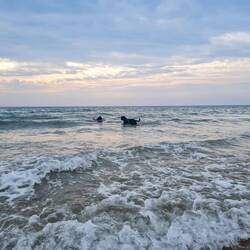 Wir bauen unser Lager auf, trinken einen Kaffe mit Blick aufs Meer und gehen anschließend eine ausgiebige Runde mit den Hunden am Strand toben. Baloo springt kopfüber in die Wellen und nutzt sie mit Hilfe seiner Schwimmweste auf dem Rückweg als Surfhilfe. Spencer lässt sich soweit animieren das er bis zum Hals von den Wellen überspühlt wird und alle zusammen genießen wir die Ruhe die hier herrscht.
