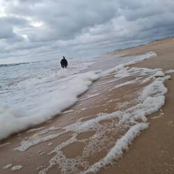 Und dann ist es endlich Zeit mal so richtig ins Meer zu springen !!! Denn endlich ist das Wasser zurück am Strand. Baloo und ich Flipper aus und freuen uns riesig... Susi und Spencer eher so gemäßigt und nur bis zum Bauchnabel. Als Susi gerade so im Wasser steht entdecke ich hinter ihr mit einmal eine Robbe aus dem Wasser gucken... ich sag euch da war sie ganz schnell wieder raus und ich wieder drin um irgendwie ein bild zu erhaschen! Immer wieder gucken die Köpfe aus dem Wasser wirklich cool nur leider etwas zu weit weg für die Handy Kamera.