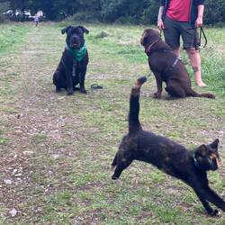 Unterwegs kam uns übrigens ein anderer Hund entgegen, an der Leine... jede andere Katze hätte sich wohl irgendwo versteckt. Nicht aber unsere Liesel. Sie ist mitten auf dem schmalen Trampelpfad stehen geblieben und hat eine Puckel gemacht bis die Fremden sich vorbei gequetscht haben. Verrückte Katze!