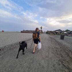 Nachdem wir unser Lager eingerichtet haben, ist es Zeit die Hunde zu lüften. Wir spazieren also los. Erst am Fluss entlang über eine schöne wilde Wiese und dann noch ein kurzer Abstecher zum Strand. Die Jungs sind glücklich und wir sind es auch und Liesel ist es auch! Denn die hat die ganze große Gassie Runde mal wieder mit uns mit gemacht. Am Strand sprechen uns 2 Spanier an, die fasziniert Liese beobachten wie sie mit uns mit läuft. Ich erkläre wir das es unsere Katze ist und das sie wie ein Hund ist. Sie lachen beide, sagen das ich das sehr gut auf spanisch gesagt habe und wünschen uns noch einen schönen Tag. Ich freu mich das zumindest ein bisschen was schon geht auf spanisch.