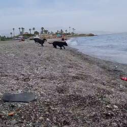 Reisen nach unserem Geschmack. Geile Straßen fahren, schöne, freundliche Begegnungen haben, gutes Essen und tolles Wetter und unbekanntes Terrain erkunden. Genauso läuft es im Moment. Heute treibt die Neugier uns weiter. Die Küste ist so wunderschön wir möchten mehr davon sehen, und unbedingt auch mal die Teile davon die ohne Promenaden und Hotels sind. Heute ist die Abfahrt schneller, denn Susi hat das Glück, dass es einen Geschirrspüler gibt auf dem Campingplatz. Es könnte sein, dass sie möglicherweise etwas viel spült hinein getan hat beim 2. Waschgang und er dann die Fliesen mot Schaumwasser geflutet hat. Das ist aber nur so eine vage Vermutung von mir ich möchte hier ja keine Falschaussagen treffen. Wir sind jedenfalls schnell auf und davon. Die Jungs bekommen noch ein letztes Mal die Chance sich am Hundestrand ab zu kühlen und dann beginnt die Fahrt. Wieder einmal wir Henry von der Sonne schnell in einen Backofen im Umluftmodus verwandelt. Eine Pause zwischendurch ist also auch bei der Heute etwas kürzeren Strecke unumgänglich. Wir verbinden das ganze mit einem Tankstop. Für 1.90€ der Liter Diesel machen wir voll und sehen dann, dass direkt gegenüber ein Chinese ist. Susi wünscht sich schon länger chinesisches Essen also machen wir auf dem Parkplatz dort halt. Ich kühle die Tiere und sie geht rein und fragt, ob es möglich ist etwas zum Mitnehmen zu bestellen. Die Angestellte versteht zunächst überhaupt nix. Offenbar spricht sie kein Englisch. Susi nimmt also den Google übersetzter zur Hilfe. Erst verneint sie das das geht, denn heute ist nur Buffet. Dich ihre Kollegen hat die Frage mit bekommen, geht kurz zwei To Go Schüsseln holen, sagt Susi kann sie am Buffet füllen und dann bezahlen kommen. Ihr könnt euch vorstellen, das Susi sich gefühlt hat wie im Schlaraffenland. Erstmal muss ganz genau gecheckt werden was es alles gibt. Nachdem sie also jedes Gericht genauestens unter die Lupe genommen hat, füllt sie uns mit tropfendem Zahn die Schüsseln voll. Freudestrahlend kommt sie mit der Beute zu uns zurück. Das Essen schmeckt wirklich ober lecker und die Hunde sind dank feuchter Tücher und Handtücher und viel trinken wieder ein klein wenig abgekühlt. Gut gestärkt geht sie also weiter die wilde Fahrt. Heute geht es immer an der Küste lang, besonders verrückt ist dabei das wir für gut 100km an großen Gewächshäuser Feldern entlang fahren. Keine aus Glas, sondern eher so mit luftdurchlässigen Planen aber davon unheimlich viele über riesige Flächen verteilt. Man kann nicht so richtig erkennen was drin ist leider aber was klar ist, dass hier ohne Bewässerungssysteme überhaupt nix geht. Die Landschaft ist trocken und felsige. Außer ein paar gabz flachen Büschen wachsen hier nur Steine und Felsbrocken. Irgendwann lässt das Navi uns von der Schnellstraße abbiegen Richtung Meer. Die Straße windet sich durch die Berge es ist eine fantastische Landschaft in der wir nun unterwegs sind. Den auserwählten Campingplatz finden wir sofort. Es ist gerade Siesta. Bis 17 Uhr noch. Wenn ihr mich fragt das einzig richtige was die bei den Temperaturen machen können. Erst warten wir geduldig vor der Reception. Eine Stunde wäre das noch. Doch dann kommt eine Belgierin vorbei. Sie fragt ob wir deutsch oder Englisch sprechen. Ich meine nur beides ist möglich. Am Ende wird es eine kleine deutsch englische Mischung. Sie erklärt uns das wir uns einfach einen Platz aussuchen können und später dann an der Reception bezahlen, wie der Türcode ist um durchs Fußgänger Tor zu kommen, falls wir zwischendurch schonmal zum Strand möchten und wünscht uns noch einen schönen Tag. Total lieb! Also suchen wir einen Platz. Lassen die Tiere aus der Sauna raus und bauen das Sonnensegel an. So zumindest der Plan. Routiniert ziehen wir es in dir Kederschiene ein, bauen die Stangen zusammen, federn sie in die Ösen, Strippen ran und Hering rein. Susi hält fest und ich schwinge den Hammer und pralle direkt mit voller Wucht wieder ab. Verdammt ich vergaß dass es hier quasi nur Felsen gibt... egal wo ich es versuche ich habe keine Chance. Eher bleibt der Hering im Hammer stecken als im Boden. Ich möchte schon wieder abbauen, als Susi die rettende Idee hat. Wir benutzen unsere beiden 20l Wasserkanister als Ankerpunkte. Das klappt sogar! Gott sei dank dann haben wir doch etwas mehr Schatten. Anschließend gehe ich zur Rezeption. Frage freundlich, ob sie englisch spricht und sie antwortet "also deutsch würde auch super gehen wenn dir das recht ist." Ich muss lachen. Hier haben wir es also mit einer deutschen Auswanderin zu tun. Total nett erklärt sie alles. Ich zahle und sage, dass wir noch unsicher sind ob wir eine oder zwei Nächte bleiben. Das ist gar kein Problem. Im Zweifel können wir morgen auch nachbuchen. Hunde müssen übrigens auf den spanischen Campingplätzen fast nie extra bezahlen. Meistens sind sie inklusive.
