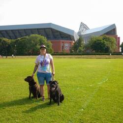 Die Gegend wird langsam aber sicher nicht blau oder rot von den Fußball verrückten (es ist ja leider Sommerpause) sondern es sticht immer mehr Pink in unsere Augen. So langsam versammeln sich die Fans dieser Wahnsinns Show rund um die Anfield Road. Wir machen erstmal einen ausgiebigen Spaziergang mit den Jungs durch den angrenzenden Park und können dabei wunderbar das pinke Treiben beobachten. Vor allem die knallpinken Hüte sind hier sehr angesagt, am liebsten kombiniert mit puscheligen Puschelschaals aus pinken Zotteln.