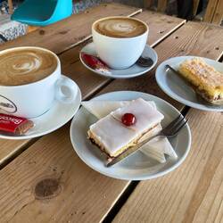 Die Dusche ist herrlich erfrischend und da das Café mit frischem selbst gebackenem Kuchen lockt können wir nicht widerstehen. Im Außenbereich sind Wasserköpfe für die Hunde verteilt und alle freuen sich über die Fellnasen.